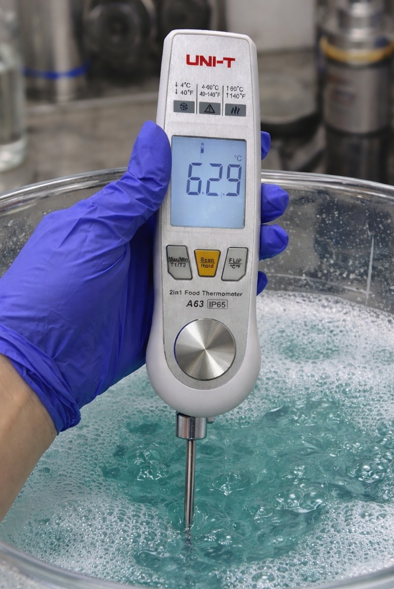 UNI-T A63 הוא מד חום מזון מקצועי 2-ב-1 המשלב מדידת טמפרטורה באינפרא-אדום ללא מגע יחד עם פרוב מתקפל למדידה פנימית מדויקת של מזון, ומספק פתרון יעיל ומהיר לניטור טמפרטורה בתעשיית המזון, קייטרינג, אחסון והובלת מזון.